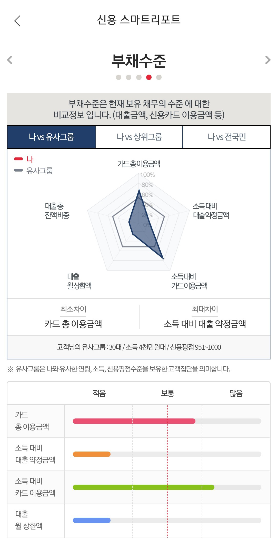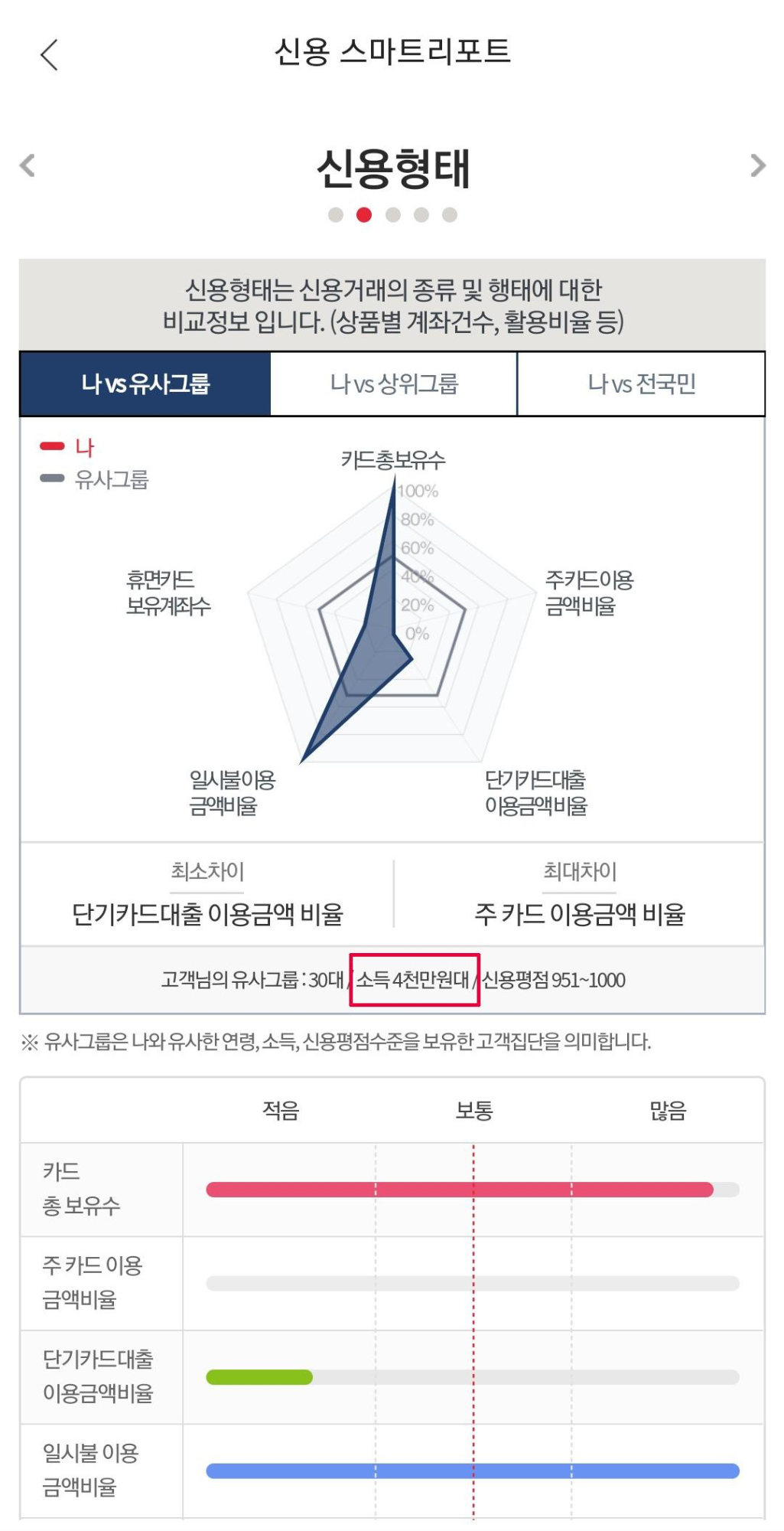 '고객님의 유사그룹: 30대 / 소득 4천만원대 / 신용평점 951점~1000점'