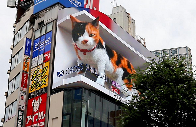 이 고양이는 신주쿠역 히가시구치 (동쪽 출구)에서 만날 수 있는 고양이로, 빌딩 최상층에 설치된 광고 디스플레이에 나오는 고양이입니다. 크로스 신주쿠 비전이라 불리는 일본 유일의 4K 화질을 자랑하는 곡면 디스플레이에 등장하는 이 고양이는 매시간 정시마다 등장하고 있는데요. 광고 중간중간에도 한 번씩 등장하고 있어 지나가는 행인들을 깜짝 놀라게 하고 있다는데요.