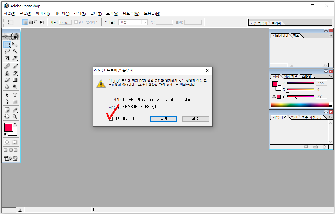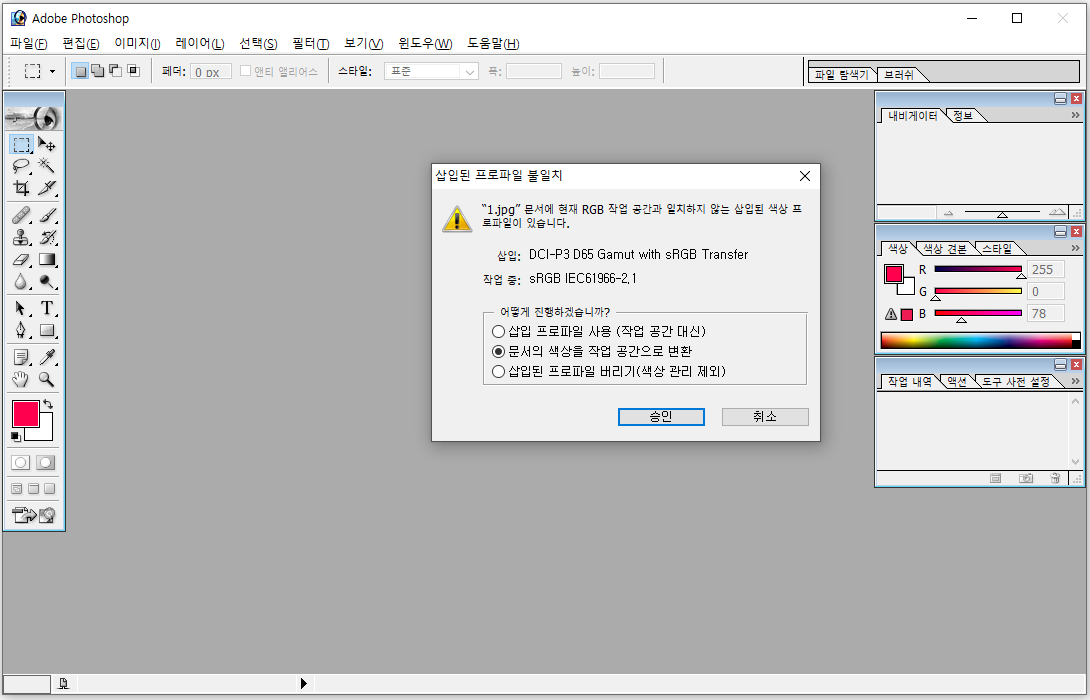 문서에 현재 RGB 작업 공간과 일치하지 않는 삽입된 색상 프로파일이 있습니다. 어떻게 진행하겠습니까?