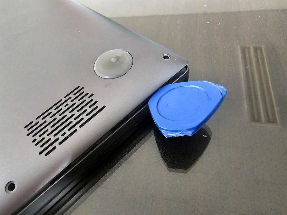 피스를 다 풀어줬다면 플라스틱 헤라로 바닥 커버를 분리해줘야 하는데요. 저는 예전에 스마트폰이랑 태블릿 배터리 구입할 때 함께 받은 플라스틱 헤라가 있어서 그걸로 쉽게 분리해 줬어요. 측면부를 잘 공략해서 틈이 보이는 곳에 끼워서 벌려주기만 하면 됩니다. 만약 헤라가 없어서 일자 드라이버로 한다면 노트북에 흠집이 발생하니 주의하시고요. 신용카드 같은 걸로 해도 휘어지기만 하고 잘 안되더라고요.