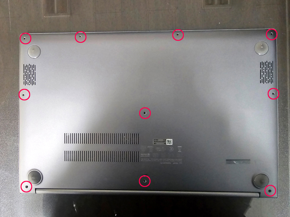 노트북 전원을 끈 후 뒤집어주세요. 작은 피스가 여러개 보일 거예요. 위 사진 동그라미 부분의 피스 10개를 풀어줍니다. 그리고 잃어버리지 않게 종이컵 같은 곳에 잘 보관해 주세요.