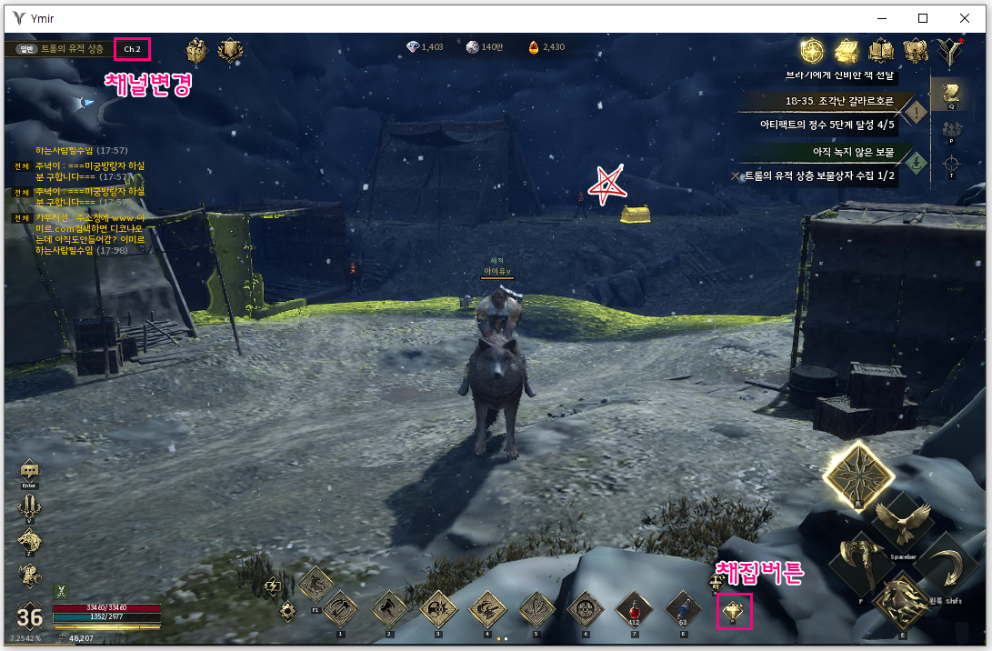 주변에 채집할 것이 없다면 탈것을 탄 상태이기때문에 빨리 이동할 수 있어서 좀 더 빠르게 진행할 수 있을 거예요. 만약 주변에 다른 유저들이 채집 중이라면 채집이 안될 수도 있으니 좌측 상단의 채널 버튼을 눌러 원활한 채널로 이동해서 진행하면 조금 더 빠르게 진행됩니다.