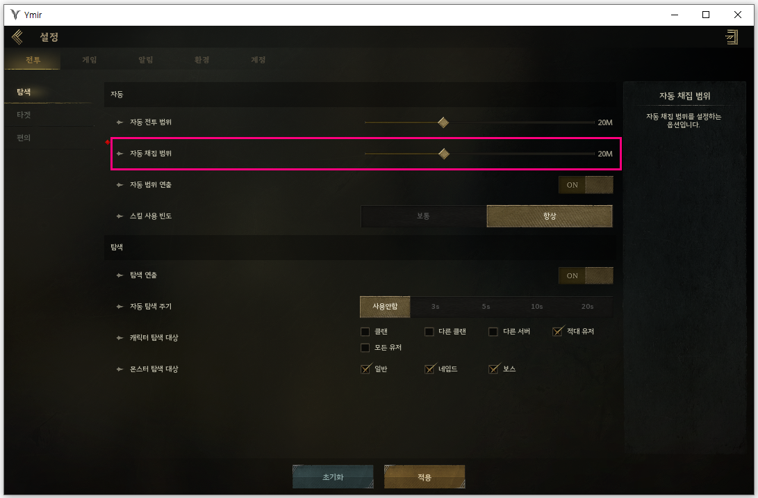 설정 - 전투 - 탐색에 보면 자동 채집 범위라고 나오는데요. 기본 20미터로 세팅이 되어있습니다. 최대 50미터까지 변경이 가능한데요. 자동 채집 범위를 50미터로 변경 후 적용버튼을 눌러 주세요.